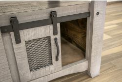 • Base features additional storage space. Functional sliding “barn door”, opens to reveal concealed storage.