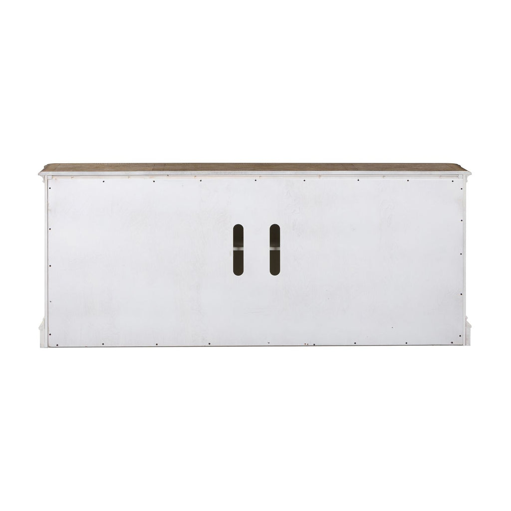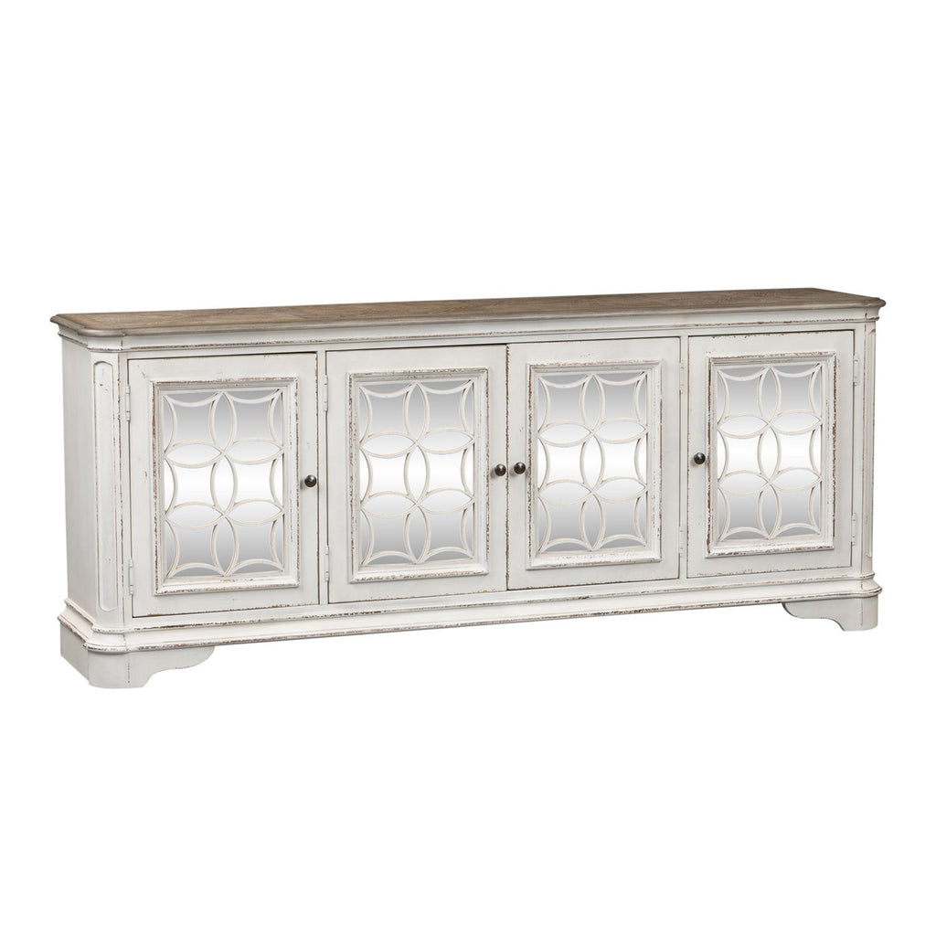 This European traditional styled 84" tv stand is sure to be the focal point of any living room. Crafted with poplar solids and white oak and birch veneers, this piece can accommodate most 92" TVs and features an antique white finish, adjustable shelf space, antique pewter knob hardware, canted corners, bracket feet, and antiqued mirror doors with decorative grid overlay. With today's modern technology in mind, users can enjoy the convenience of the wire management provisions to hide those pesky wires from your DVD player or gaming console of choice. Create your own look and change out two or all four doors to display either the wood framed panel doors or the option of antique mirror with decorative overlays. These versatile options allow you to be creative with your furniture.