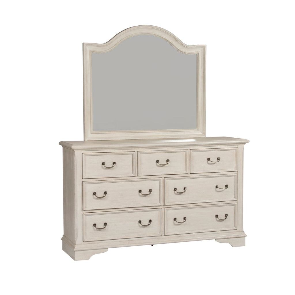 Enhance your room with this timeless Bayside queen panel bed, dresser and mirror, chest, and nightstand kit, creating a shabby chic interior that all homeowners love. Crafted of pine solids and acacia veneers, this kit is unique with its antique white finish accented by heavy wire brushing. The bed features chamfered posts, an arched cap rail, planed panels offering dimension, bolt on rail system and center supported slat system, ensuring reliability and longevity. The dresser, chest, and night stand feature full extension drawer glides for easy access to storage, fully stained interior drawers, bead molding, chamfered pilasters, wood framed drawer fronts, bracket feet, and is accented by antique pewter bail hardware. The mirror is elegantly arched with beveled glass, creating dimension.