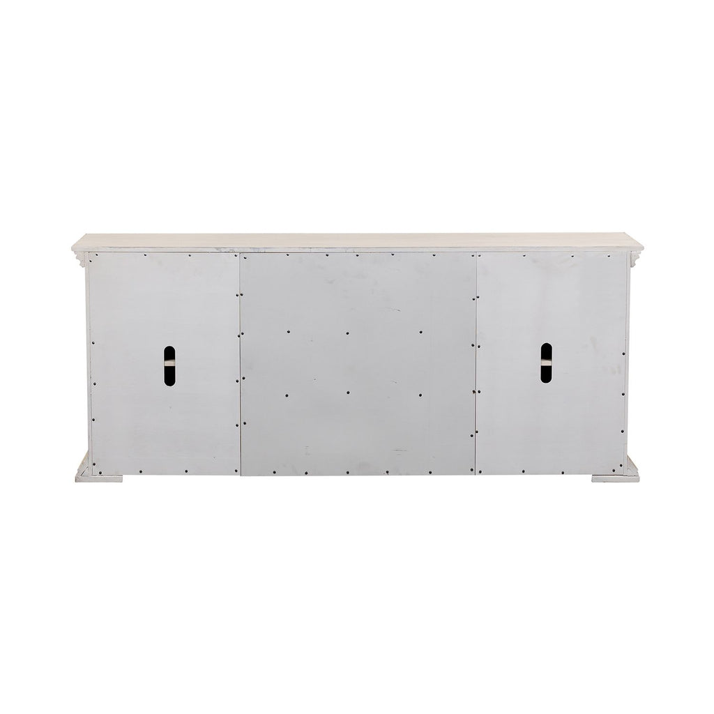 Kick up your feet and marvel at the beauty of the Big Valley seventy-six inch TV console. Crafted with excellence using rubberwood solids, this TV console features a Whitestone finish with heavy distressing and rub through. There are three full extension drawers with the top drawer featuring felt lining and a bluff-cut drawer front giving the illusion of multiple smaller drawers while still offering deep storage. There are two doors with an adjustable shelf behind each door and wire management provisions to help keep things looking neat and tidy. All the drawers and doors have wood framing. The large, graduated bead molding creates architectural interest. With the ability to accommodate most eighty-five inch TV’s, the Big Valley seventy-six inch TV console is sure to be a piece passed down for generations.
