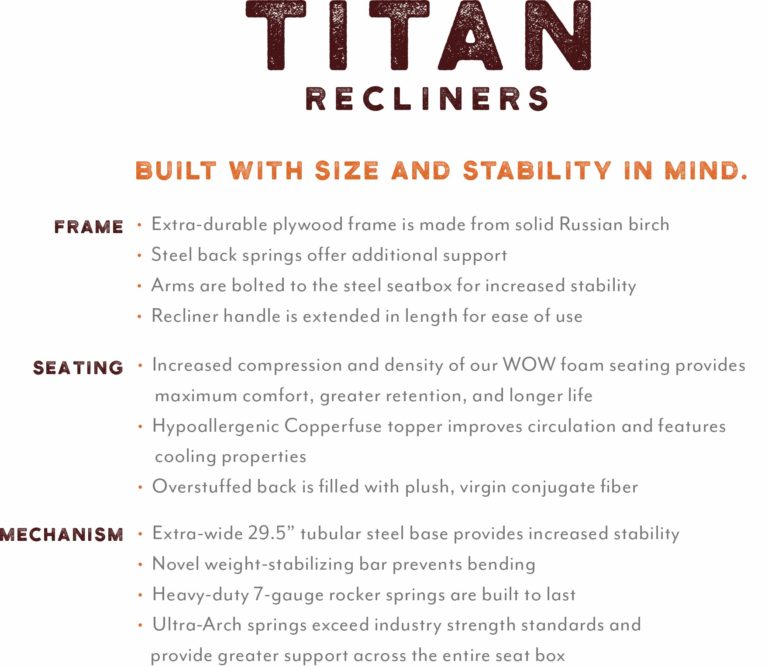 The 9534 Caesar Oversized Recliner, part of our Titan Series, offers unmatched comfort and durability for those who demand the best. This Titan oversized rocker recliner features a 24” extra-wide seat and fully reclines to the length of a king-sized bed for ultimate relaxation. Built with Ultralign Reclining Technology, it includes a 29.5” tubular steel base, Ultra-arch springs, and a larger metal seat box to create the perfect “sweet spot” of support across the entire seat.