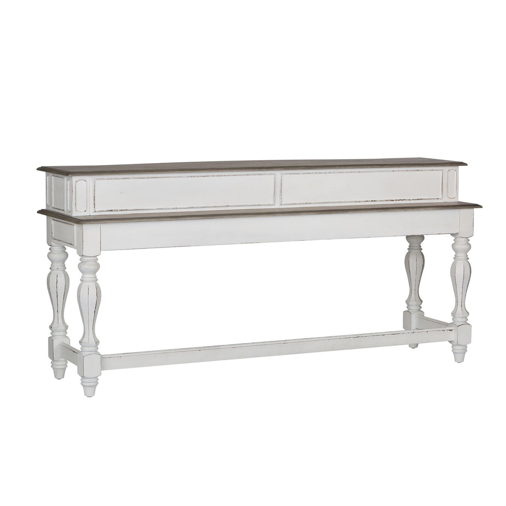 The perfect blend of European design with the Magnolia Manor console bar table and stools. Crafted of poplar solids with white oak and birch veneers. Finished in an antique white with heavy chipping and a weathered brown with whitewash top to give you that true vintage feel. Features fancy face veneer pattern on top, bead molding faceted turned legs, three separate storage compartments and cushioned upholstered seat with a return swivel mechanism. Warm finishes and artistic distressing along with grand scale create a piece to be passed to generations. Kit consists of one console bar table and three stools.
