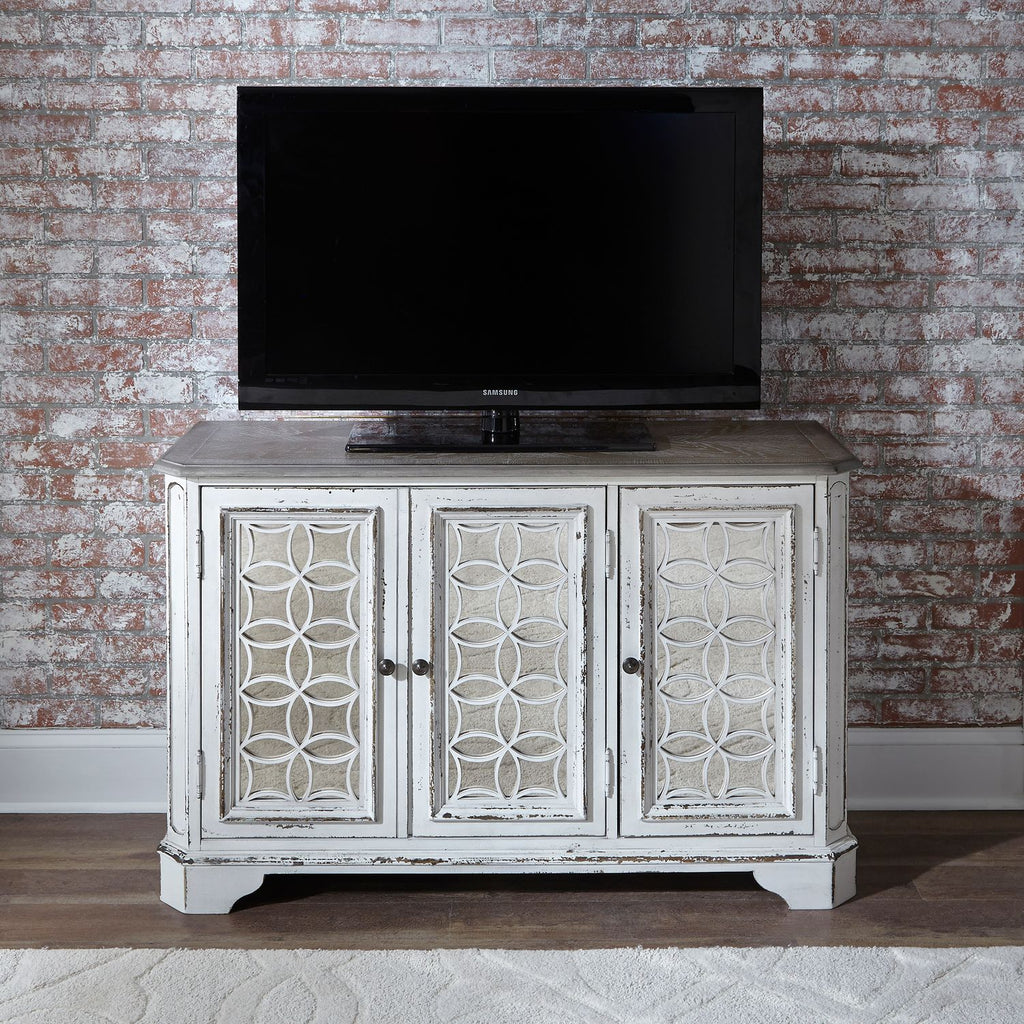 Accent your space with the perfect blend of European design with the Magnolia Manor hall console. Crafted of poplar solids with white oak and birch veneers, this piece features a fancy face top finished in a weathered brown with whitewash, canted corners on the front, bead molding, two adjustable shelves hidden behind three decorative wood framed mirrored doors, and is anchored by bracket feet. The hall console can be used as a decorative piece in an entry-way or as a tv stand! With today's modern technology in mind, users can enjoy the convenience of the built-in wire management provisions, perfect for accommodating DVD players or a gaming console. Warm antique finishes and artistic distressing along with grand scale create a piece to be passed to generations.