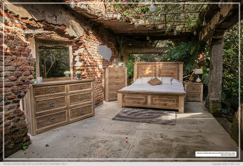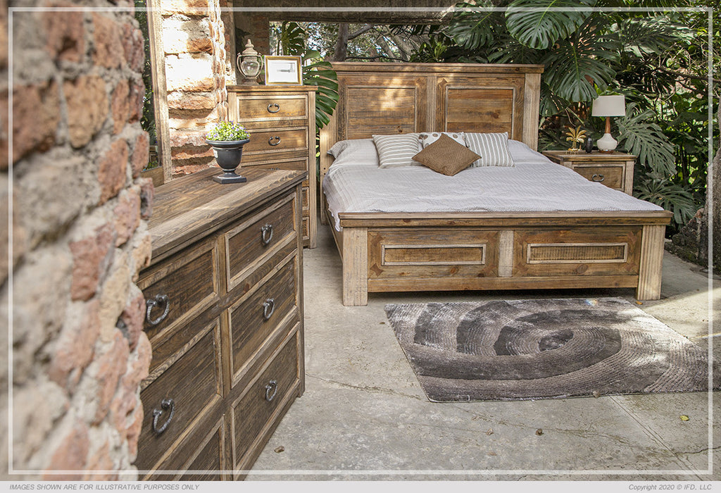 - Multi-step lacquer finish on wire-brushed wood provides depth and character