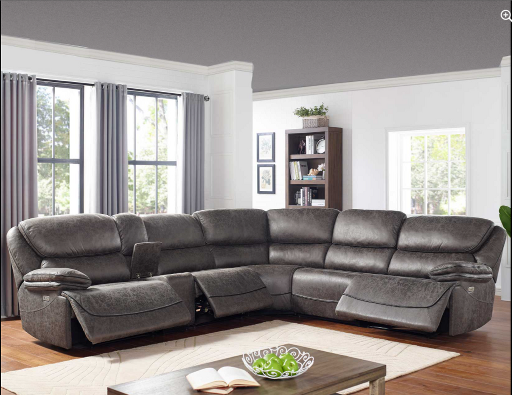Fill the entire room with the reclining comfort of Plaza. This power sectional is large enough to seat all your family and friends with enough power options for everyone to enjoy. Revel with friends in the comfort of the extra-wide seating and extra-wide arms. The powered footrest operates with the touch of a button and the smoked grey fabric looks like suede and fits with many decors.