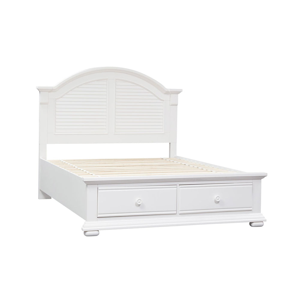 Live life beautifully with the Summer House I queen panel bed, dresser, mirror, and nightstand. Crafted of poplar and pine solids this kit features an oyster white finish, bead molding, bun feet, full extension drawers with felt lined top drawers, and is accented with wooden knob hardware. The panel bed features louvered panels and arched crown molding. The dresser has two louvered panel doors and five drawers including two smaller flip down top drawers. Attach the arched louvered panel mirror with a beveled edge with the included bolt-on supports. Place the unique one drawer, two door nightstand next to your bed and enjoy the abundance of storage with the felt lined top drawer and the adjustable shelf behind the louvered panel doors. With cottage design always in fashion, make the Summer House I a staple in your home.